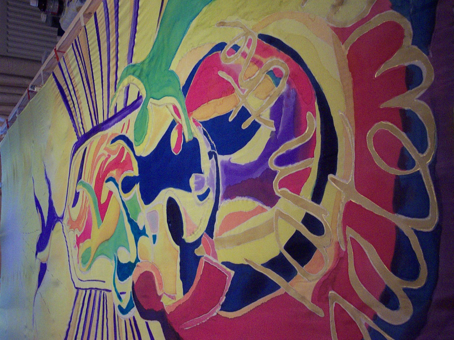 Large banners take a while to complete. They are painted on Habotai 10, backed with stiffener and with tab headings.